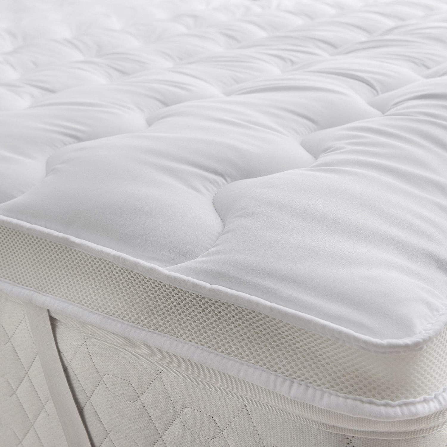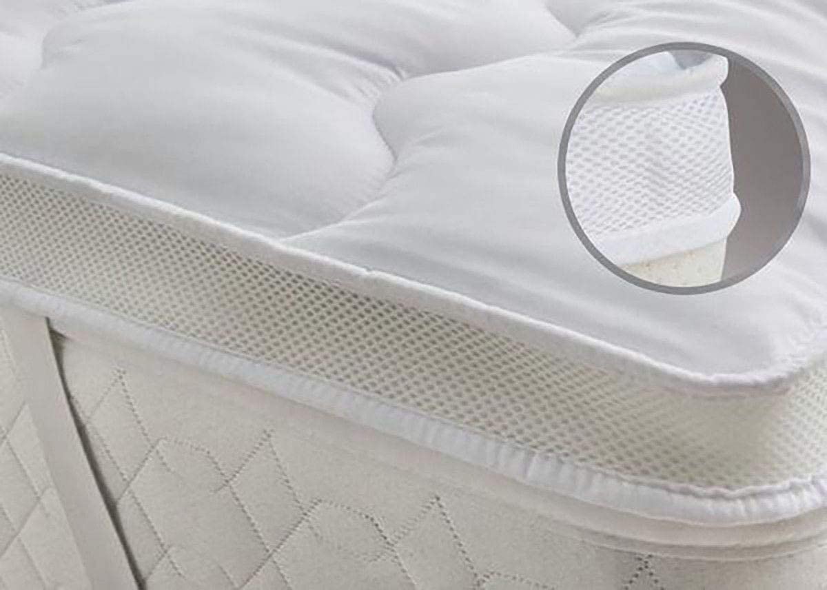 Premium Quality Temperature Control 500gsm Mattress Topper with a Long lasting super soft spiral bounce back polyester hollowfibre filling. The elasticated corner straps will hold the topper firmly in place. This Air Flow Mattress Topper has a unique 5cm mesh fabric around the edge allowing fresh air to ventilate the topper keeping the body cool and dry for a more comfortable night sleep.