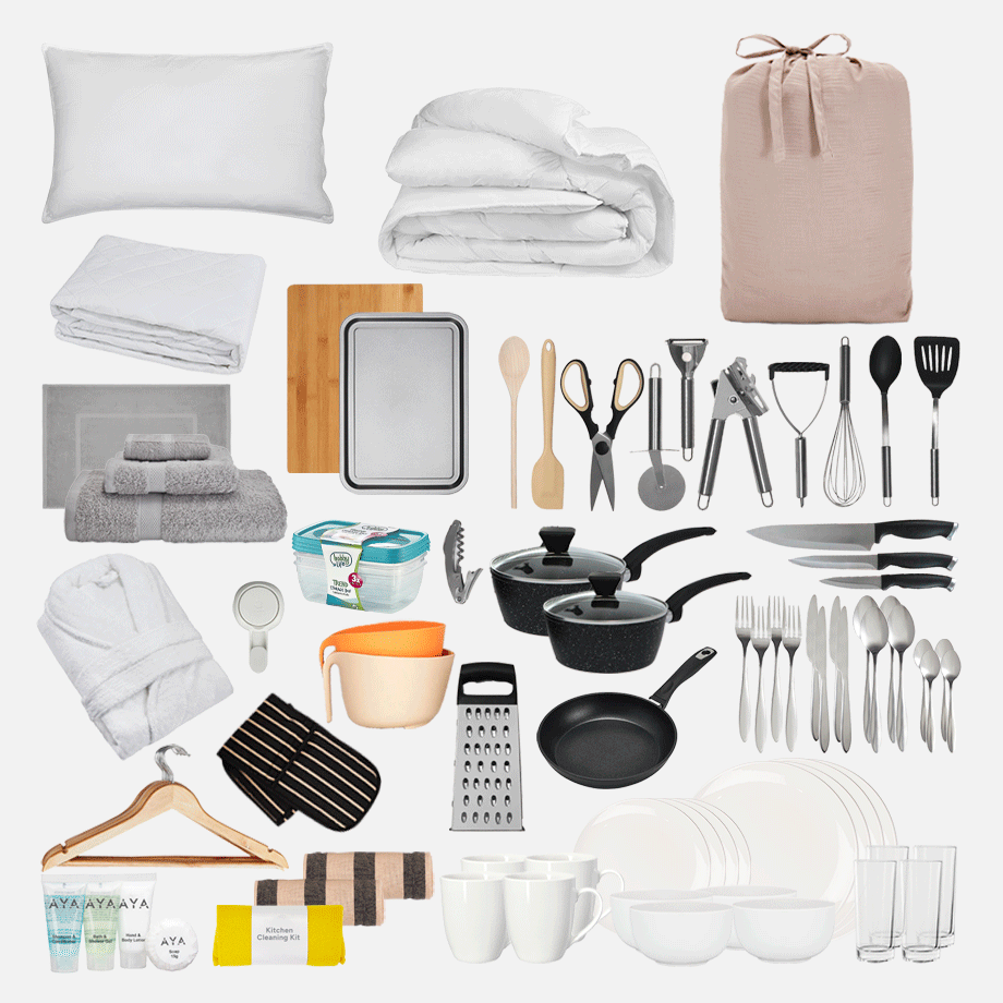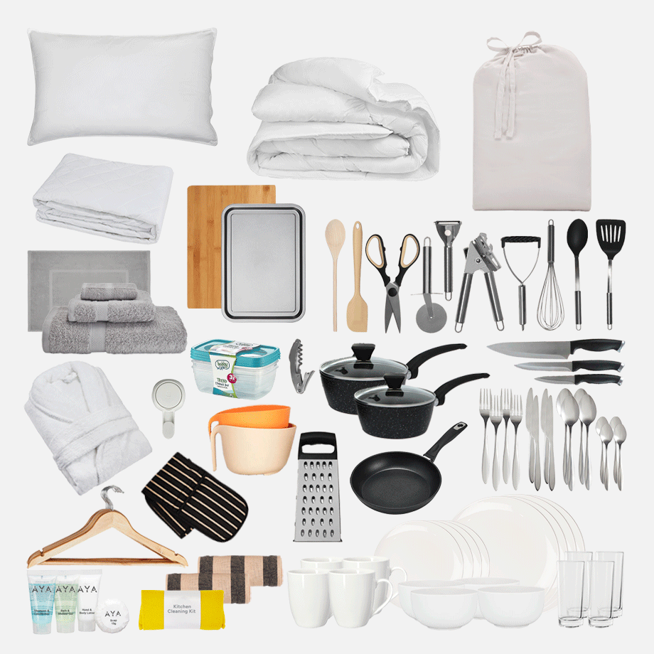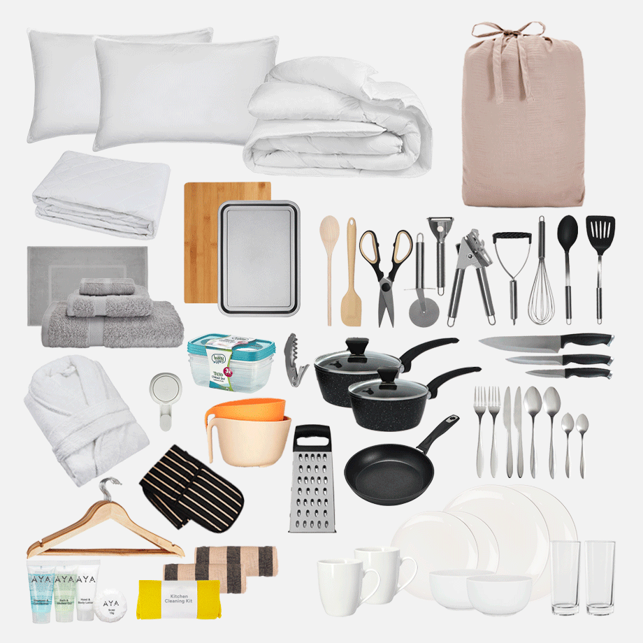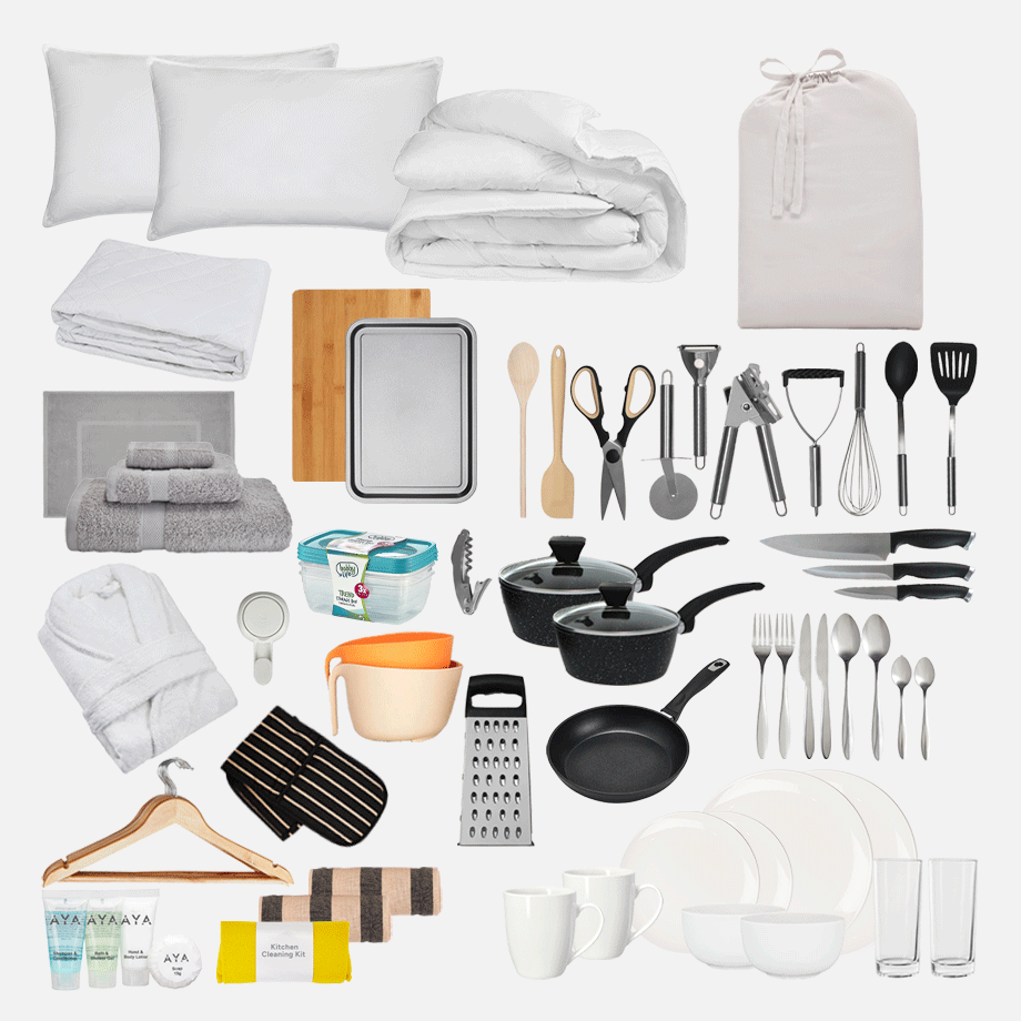 Bathroom Kit – No more sharing sponges or running to the shop for towels. This kit has everything you need to keep fresh, including towels, a bath mat, and handy bathroom must-haves.