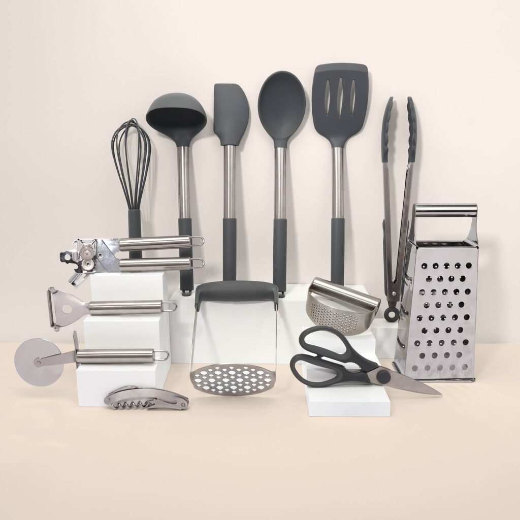 Premium: 12pc Utensil Kit including: 1x Masher | 1x Solid Spoon | 1x Slotted Turner | 1x Spatula | 1x Stainless Steel Whisk | 1x Stainless Steel Pizza Cutter | 1x Wooden Spoon | 1x Stainless Steel Peeler | 1x Stainless Steel Can Opener | 1x Stainless Steel Corkscrew | 1x Kitchen Scissors | 1x Stainless Steel Grater